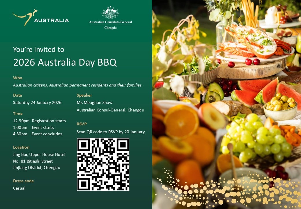 The Australian Consulate-General in Chengdu invites all Australian citizens, Australian permanent residents and their families in southwest China to an Australia Day BBQ at Upper House Chengdu on Saturday 24 January 2026.